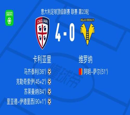 北京时间2月1日意大利足球顶级联赛 联赛 第23轮,卡利亚里主场对阵维罗纳。卡利亚里马齐泰利破门,克勒奇索伊破门,苏莱曼纳破门,里亚德-伊德里西破门。最终比分卡利亚里 4-0 维罗纳。